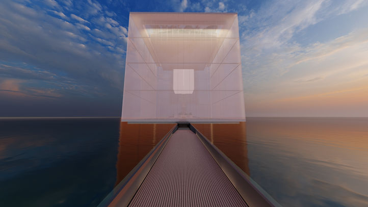 The hub of life after death is located in the middle of an ocean of calm waters, where newly arrived souls begin their journey on a submerged walkway. The end of this route is at the base of a giant translucent cube, at the top of which you can see the Garden of Eden.