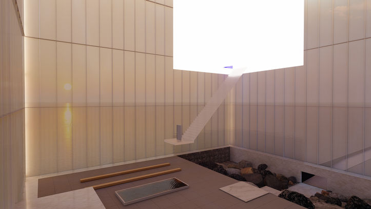 When accessing the cube, souls find a large marble staircase on a rock - the transition from material life to eternal life - leading to an immense lobby, a space for contemplation and reflection. In this reception area, souls are instructed to follow one of the two paths in a maze.